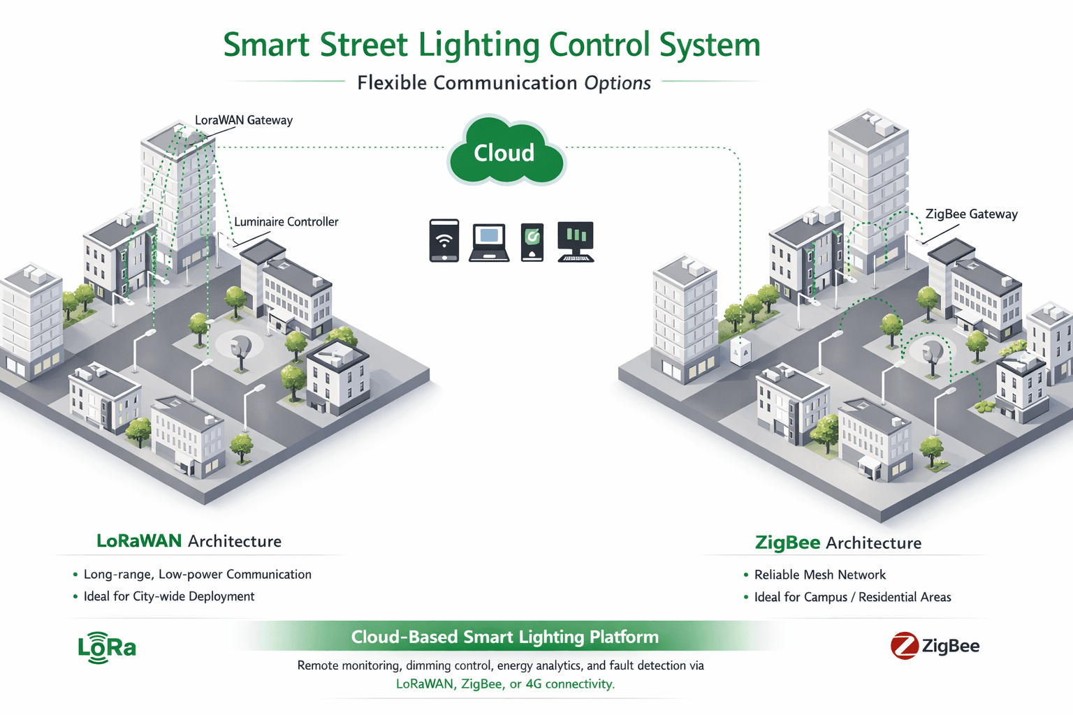 Supports 0–10V, DALI2, and D4i dimming, with NEMA or Zhaga interfaces; compatible with photocell, motion sensors, Zigbee/LoRa for intelligent lighting systems and future upgrades