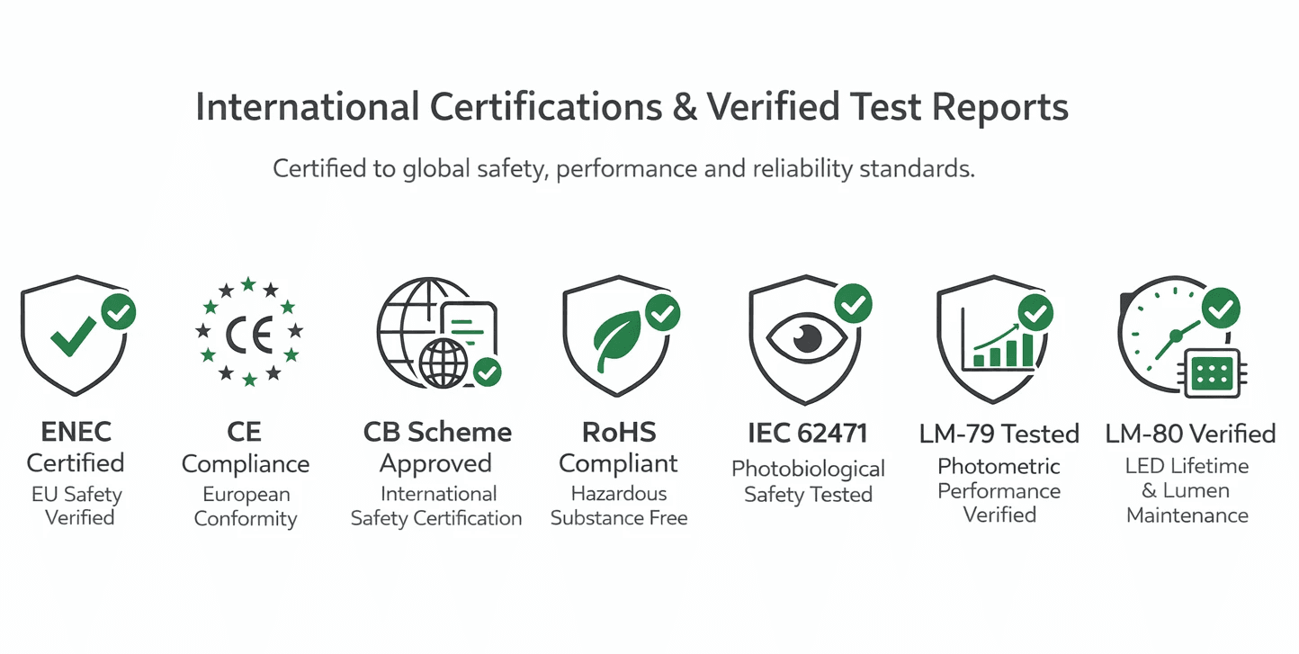 Our luminaires are backed by comprehensive certifications and verified test reports, including ENEC, ENEC+, CE, CB, RoHS, IEC 62471, LM-80, and LM-79, ensuring proven quality, safety, and performance compliance with international standards.